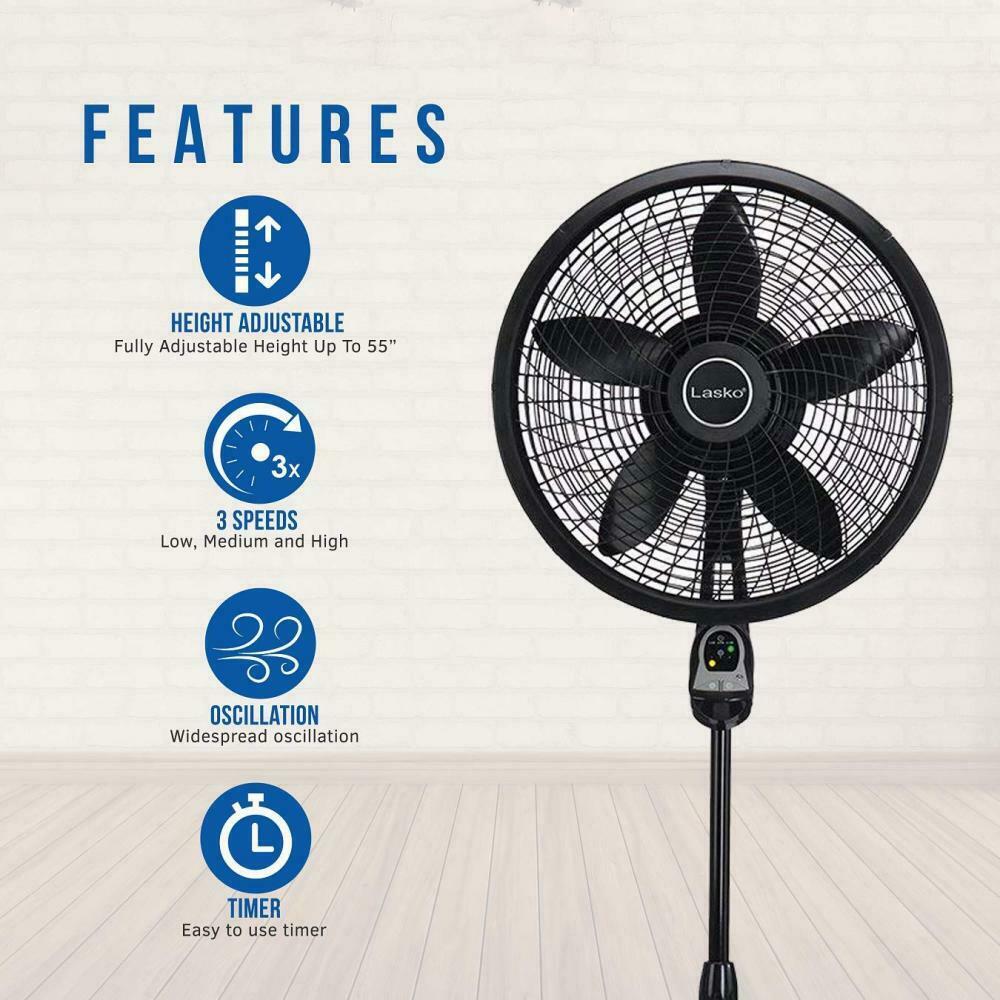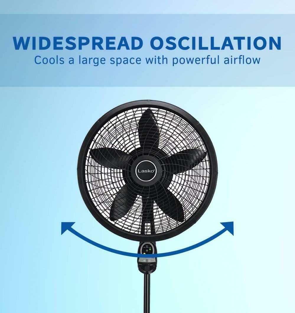 The Lasko pedestal fan is equipped with a multi-function remote for easy and convenient use. The 5-paddled 18? fan blade is powerful enough to cool even the largest home spaces. Between the simple ?no-tool? assembly and the electronic auto-off timer this fan is a simple and suitable item for those hot summer days. The three energy-efficient speeds direct air where needed to provide air flow exactly where you desire