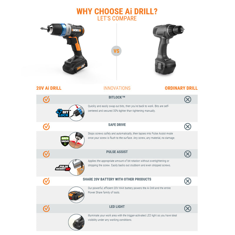 Product description: The first drill with Advanced Intelligence Technology; the Worx® Ai Drill gives you the confidence to tackle any drilling or driving project. Innovations like BitLock™ Safe Drive and Pulse Assist let you instantly tighten bits, drive a screw to just the right depth, and even remove stripped screws...