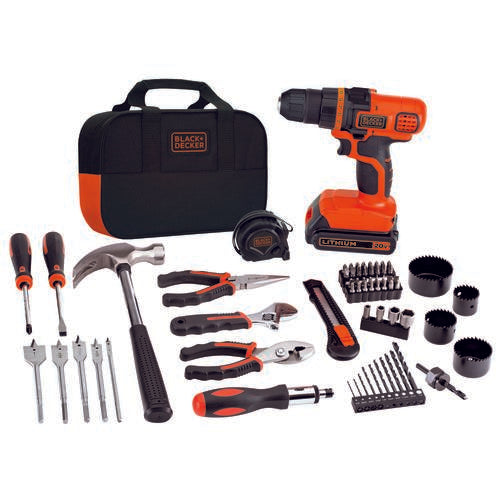 The BLACK+DECKER™ 20-volt lithium-ion drill and project kit is a great set for a variety of home projects. The drill provides an extra level of control with an 11-position clutch that prevents stripping and overdriving screws. The lithium ion battery is always ready and holds a charge up to 18 months. This kit includes 66 hand tools and accessories and a carrying bag for easy portability and storage.